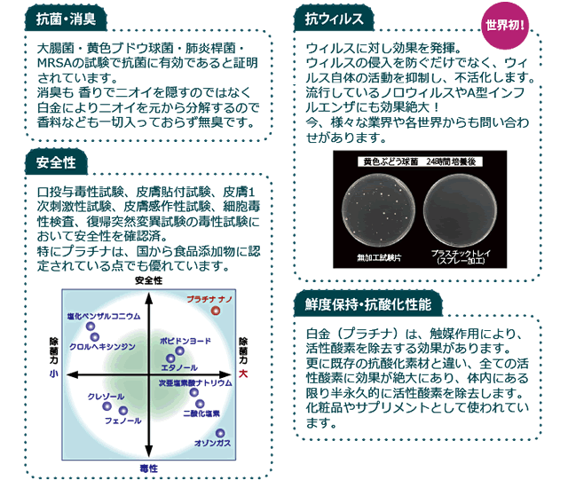 | ■「白金ナノ粒子の効果の凄さ!」 主に【抗菌】【消臭】【抗ウィルス】また【鮮度保持、抗酸化性能】の効果があり、 タイルや、ビニール・金属・ガラス・陶器・プラスチックなど簡単に付着し、暗闇でも効果を発揮など多種多様 素材を選ばず簡単に固着する事ができます。 また、長時間効果を維持できる凄さを持っています。 繊維では50回の洗濯試験をクリア、病院・学校などの壁施工では2年以上抗菌・消臭効果が持続しています。 |
