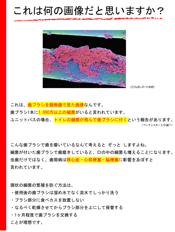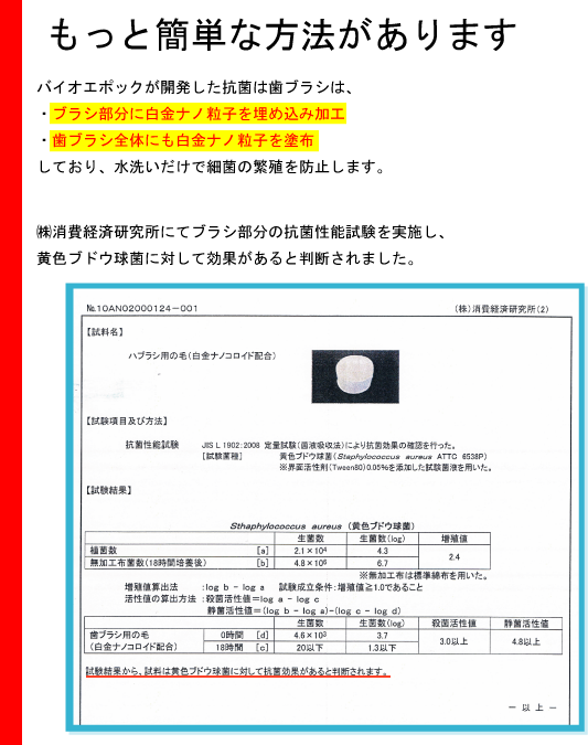 最高級の白金(プラチナ)ナノ粒子をブラシ部に練り込み、ハンドル部に塗布加工し固定化しました。白金(プラチナ)ナノ粒子が歯ブラシに付着した雑菌の増殖を防ぎます。