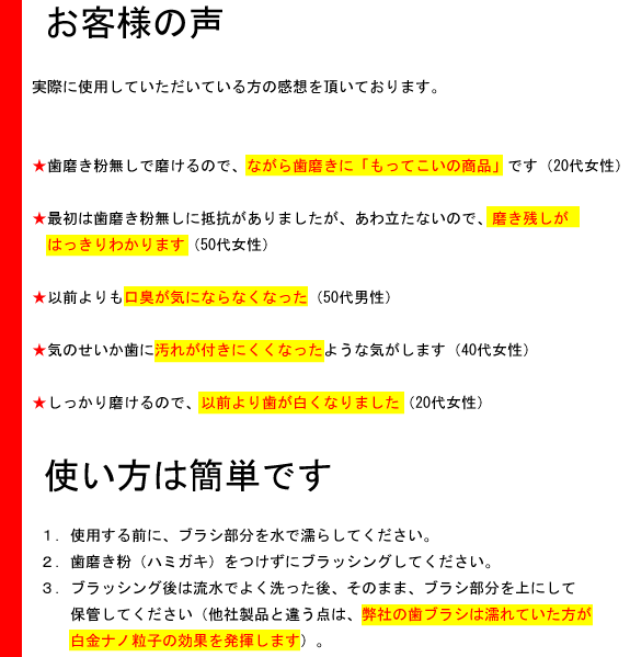 触媒化学による最新テクノロジー ブラシ部(毛)に高級な白金(プラチナ)ナノ粒子を練り込み加工に成功し、白金(プラチナ)ナノ効果で口内の歯周病の予防に絶大な効果を発揮します。 特に、消臭効果は他にない効果があり、口臭が気になる方が特におすすめです。また、ハンドル部まで白金ナノ粒子が付着しているので抗菌・抗ウイルス効果あり、小さな子供様にも安心してお使いできます。